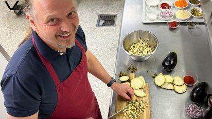 Anstelle des Rindslungenbratens wird eine Aubergine verwendet, die man in möglichst kleine Stücke hackt, um sie in der Pfanne anzuschwitzen. Ich sag's gleich, mit dem Küchenmesser hab' ich's nicht so, und so durfte mir unser Schloss-Küchenchef Ales, der aktuell die Küche in der Kothmühle mit seinem Know-How unterstützt, die Stücke dann noch ein wenig „nachhacken“. In manchen Rezepten wird auch von technischer Hilfe gesprochen, um die Stücke noch kleiner zu bekommen. Das wäre sicher eine Überlegung wert gewesen. ;-)