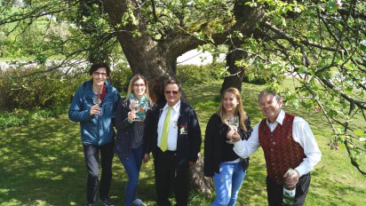 So auch die Sorte von Mostbirnen, die ein mächtiger Baum bei der dritten und letzten Station der Fahrt jedes Jahr abwirft. Die Hauerbirne, ist eine ganz spezielle und hier in milder Süd-Ost-Lage bei Amstetten steht der „Mutterbaum“. Mostbaron Hauer führt mit sichtbarem Stolz rund ums Haus, zeigt die selbstgestaltete Sgraffiti-Fassade und eben jenen Hauerbirnbaum. Während der musikbegeisterte Hausherr von den regelmäßigen Veranstaltungen im Innenhof seines Vierkanters erzählt, den Obstgarten zeigt, findet die Most Tasting Tour bei einem Schlückchen Exibatur ihren Ausklang. Wir haben bei unserem Test der Most Tasting Tour Mittagessen und die dritte Station unserer Fahrt zusammengelegt. So genießen wir den letzten der drei Gourmetmoste, den Exibatur, und eine umfangreiche Jause. Der erdige Charakter dieses kraftvollen Mostes ist wieder mit einem alten Mostviertler Ausdruck nämlich für ein schweres Ackergerät, gut gewählt.