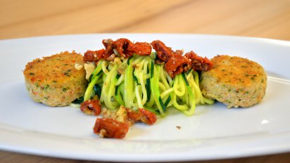 Rezept: Berglinsenlaibchen mit Zucchinispaghetti auf Walnuss-Paradeiser-Pesto